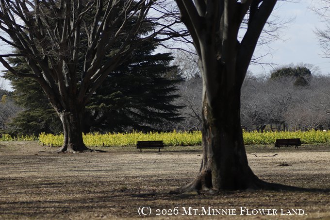 みんなの原っぱの大きな木と菜の花のお花畑.